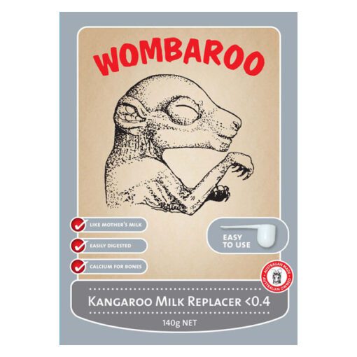 Wombaroo Kangaroo Milk Replacer <0.4 is a nutritionally balanced milk substitute for macropod (kangaroo & wallaby) joeys with less than 40 % of their pouch life completed. Joeys at this stage are furless, pink skin, eyes closed, ears down. Entirely pouch bound. Faeces yellow custard consistency.
