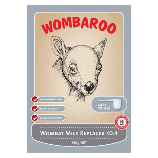 Wombat Milk Replacer <0.4 is a nutritionally balanced milk substitute for wombat joeys with less than 40 % of their pouch life completed. Joeys at this stage are furless, pink skin, eyes closed, ears down. Entirely pouch bound. Faeces yellow custard consistency.